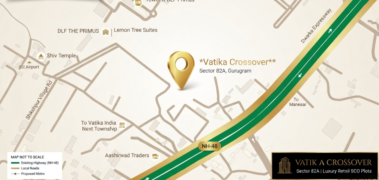 Crossover at Vatika City Centre is a uniquely designed, open-to-sky commercial landmark located at the intersection of NH-48 and Dwarka Expressway (Sector 83). This two-sided frontage project offers a premium mix of high-street retail, anchor stores, and boutique office spaces. With its strategic "island" plot and direct visibility from the highway, it serves as the primary commercial catchment for the massive Vatika INXT township.